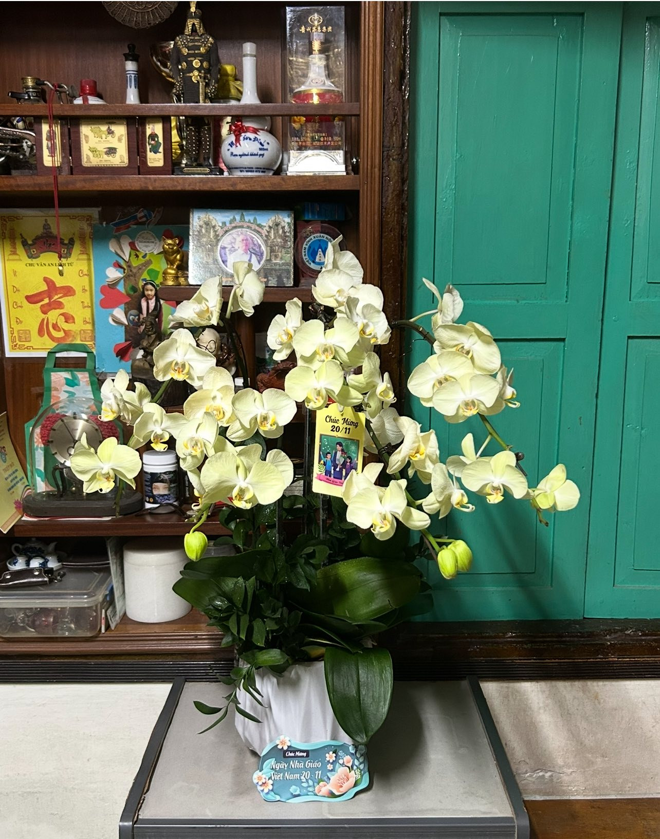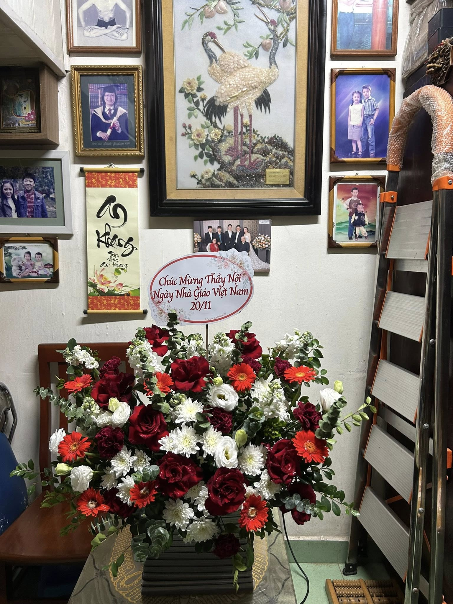 Hôm nay, 20/11/2025, tôi rất vui. Tối nay đi dạy về, tắm táp xong, trước khi ăn cơm tôi chỉnh trang lại chậu Lan, chậu hoa tôi được các học trò tặng hôm sinh nhật tôi 22/10/2025 và cũng là ngày tôi làm Lễ phong Võ sư cho ba học trò của tôi, để trong nhà cũng có hoa ngày 20/11. Vợ chồng tôi chăm chút tưới hàng ngày, nên đã qua suýt soát 1 tháng, nhưng hoa vẫn thấy đẹp. Tuy nhiên khi đang ăn tối, người học trò Phạm Hoàng Nam, lớp B15, sau khi đi làm về, dù muộn, nhưng vẫn mua một lẵng hoa lên nhà tặng tôi nhân ngày 20/11. Lẵng hoa rất đẹp, vợ chồng tôi rất vui, nhà đã có một lẵng hoa mới. Tuy nhiên tôi vẫn dùng chậu hoa Lan tôi đã chỉnh chu.